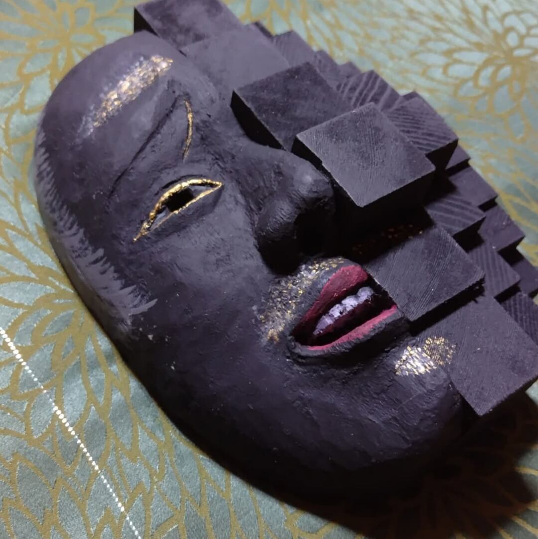 Abstract mask half in cubes representing digital pixel and other half is an actual mask of Chujo (Lieutenant General) mask for No theatre.